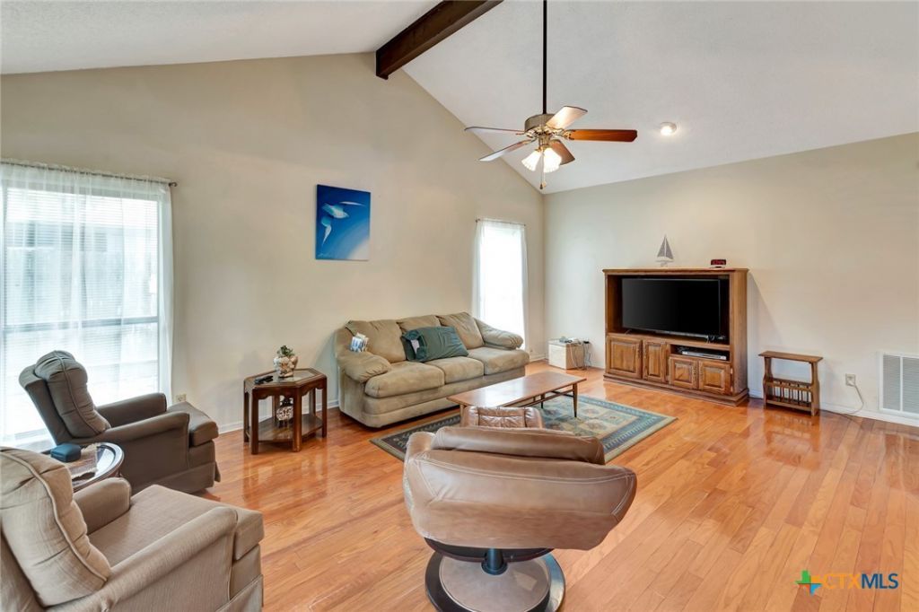 Well-maintained 3-bedroom, 2-bath home offering 1,414 square feet in an established Victoria neighborhood. Built in 1982, the home features a spacious living area with vaulted ceiling and exposed wood beam, plus hardwood flooring throughout the main living spaces and bedrooms. The galley-style kitchen includes white cabinetry, stainless appliances, decorative tile backsplash, and tile flooring. Both bathrooms have been updated, including a walk-in shower with marble-look tile surround, dual shower heads, built-in bench, and frameless glass enclosure. Additional features include a two-car attached garage, covered patio, wood deck, and a fully fenced backyard with a shed, shaded by mature oak trees. Buyer to verify all measurements, schools, and property details.