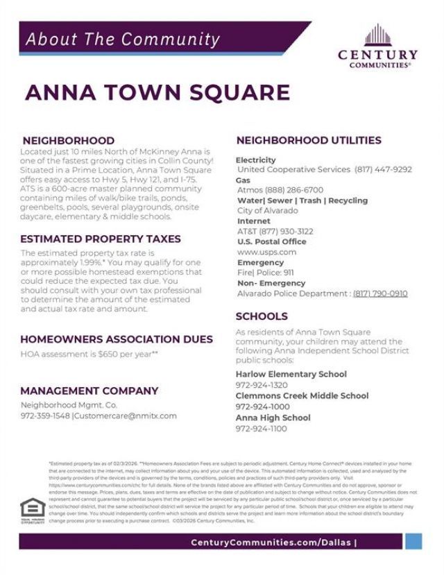 BRAND NEW COMMUNITY! We’re all about the Aiken plan! This one-story gem offers four bedrooms, including a primary suite with a walk-in closet and a private bath. A sunlit great room is adjacent, leading to a covered patio. The dining area and the open kitchen with a center island and a large walk-in pantry are steps away. Two full baths, a laundry, private study, and mudroom complete the attractive Aiken. Designed for everyday convenience and livability, Anna Town Square blends residential comfort with walkable amenities and easy regional access. Inviting streetscapes, a sparkling pool, nature trails, green spaces, and planned gathering areas create a connected neighborhood feel with plenty of opportunities to enjoy the outdoors. Located just minutes from US 75, Anna Town Square provides a convenient commute to McKinney, Frisco, and the greater Dallas Fort-Worth area while maintaining a welcoming small-town atmosphere. Est. July completion!