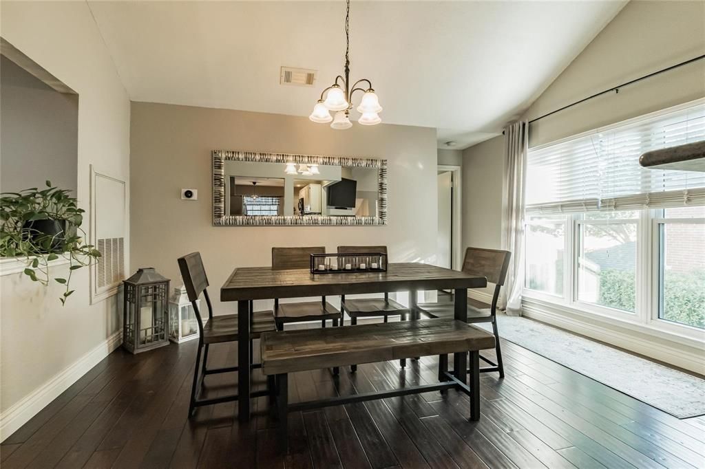 Beautifully updated 3 bedroom, 2 bathroom with a study OR could be used as a fourth bedroom with closet. This home features custom grey paint colors and vaulted ceilings. Stainless steel appliances including the refrigerator and washer and dryer, as well as sought-after hardwood floors throughout the home. A lovely window seat in the kitchen adds optimal seating and fun architectural niches that welcome your own personal flair for interior design. Ideal location off Old Denton Road and near President George Bush Turnpike