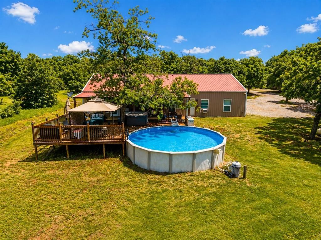 Enjoy peaceful country living with this 3 bedroom 2 bath barndominium situated on 10 beautiful acres with mature hardwood trees and plenty of room to roam. The home offers a comfortable and functional layout with dedicated office space ideal for working from home, hobbies, or flex use.Outdoors, the property is set up to enjoy year round. A stocked tank approximately 14 feet deep is home to bass and catfish, creating a great spot for fishing and relaxing. Unwind in the hot tub or cool off in the above ground pool featuring a large deck with scenic views of the surrounding acreage.Need space for equipment, vehicles, or projects The 30x50 three bay shop offers excellent storage and workspace, plus a 24x40 overhang for additional covered parking or outdoor use.Whether you are looking for a full time residence, weekend getaway, or small acreage retreat, this property offers a great combination of comfort, function, and outdoor enjoyment. Rare opportunity to own acreage with trees, water, and valuable improvements.