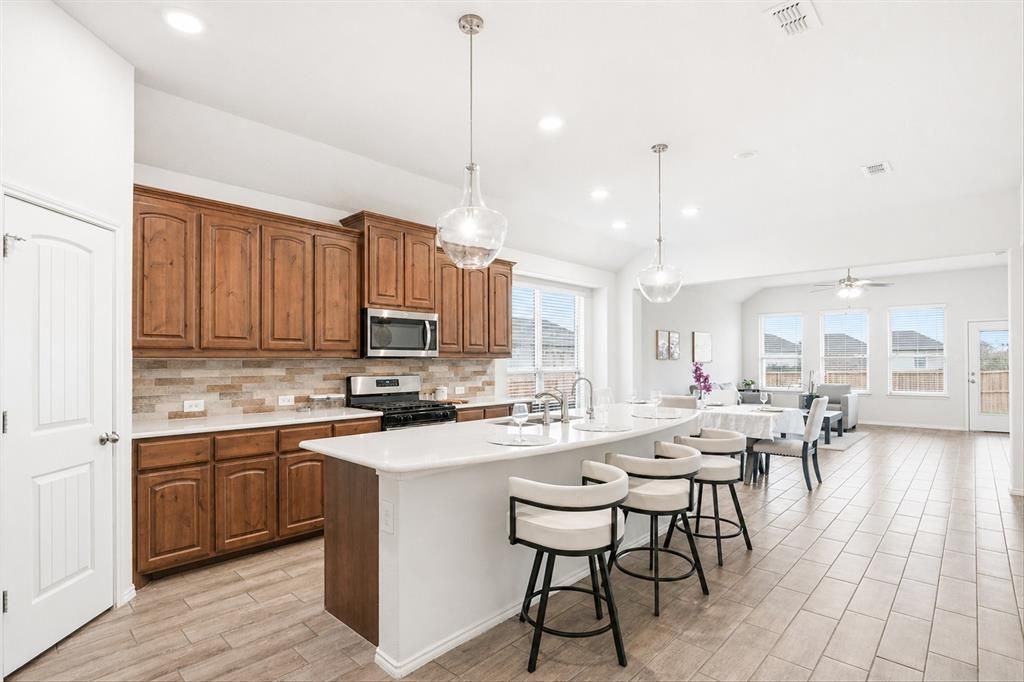 Located in the desirable Hartland community, this move-in ready Antares Homes build offers a functional layout with stylish finishes throughout, including wood-look tile flooring and a covered patio.The open-concept kitchen sits at the heart of the home and features a large island, quartz countertops, stainless steel appliances, ample cabinetry, and a walk-in corner pantry. It flows seamlessly into the breakfast area, highlighted by a cozy window seat.A private study with double doors provides the perfect space for a home office. The primary suite offers a relaxing retreat with dual vanities, a garden tub, separate walk-in shower with seating, and a linen closet.Three secondary bedrooms are located toward the front of the home and share a full bath with dual sinks, making them ideal for family or guests.