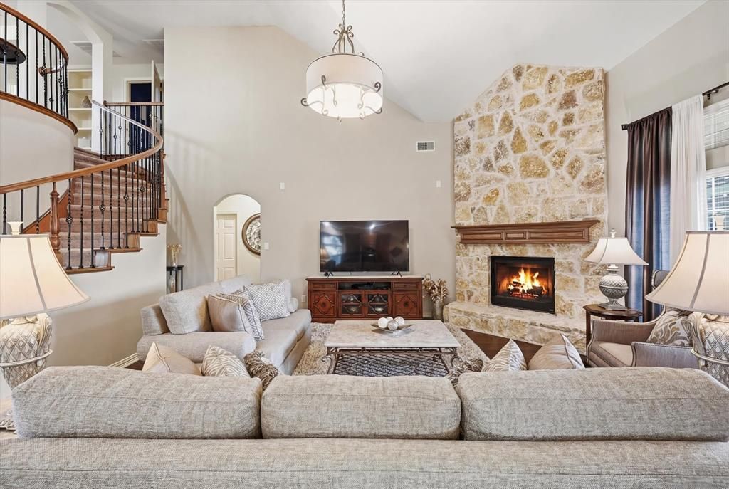 Stunning luxury home tucked away on a quiet cul-de-sac, offering 4 spacious bedrooms with a private primary suite on the first floor and secondary bedrooms upstairs. The primary suite features its own fireplace, creating a warm and relaxing retreat. A dedicated office with French doors provides the perfect work-from-home space. The island kitchen is beautifully upgraded with added cabinetry, granite countertops, striking backsplash, and double ovens—ideal for both everyday living and entertaining. The open-concept living area showcases rich hardwood flooring, soaring ceilings, abundant natural light, a decorative stone fireplace, and a striking curved wrought iron spindle staircase. The media room is fully equipped with a projector, surround sound, theater lighting, sink, and mini fridge—your own private cinema experience. An exceptional outdoor living space awaits, complete with a heated saltwater pool and spa, an extended covered patio with a summer kitchen, and a detached pool lounge with a mini-split for year-round comfort. Additional highlights include an extended driveway, privacy fencing, storm doors, gutters, and French drains. VA assumable loan is available at 2.5% interest rate.