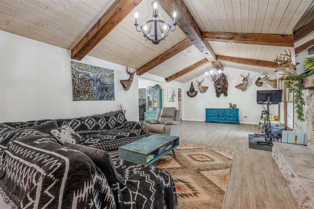 Agent Owner. Set on 4.7 acres, this 3 bed, 2 bath property offers the perfect blend of modern updates and wide open space. Inside, you are welcomed by an enormous living room featuring stunning wood plank vaulted ceilings with accent beams and a striking stone fireplace, an ideal space for gathering or relaxing. The kitchen has a sleek, modern feel with natural stone countertops, stainless steel appliances, and brushed gold fixtures. A cozy eat in breakfast area includes a charming window seat and breakfast bar, making it the perfect spot to start your day. The primary suite is a true retreat, offering plenty of room for a king size bed plus additional space for a sitting area, home office, or workout setup. The ensuite bath features a double vanity, walk in shower, soaking tub, and a spacious closet. A sunroom provides a great place to entertain or simply unwind while taking in views of the property. Outside, the acreage is ready for your animals with a barn with stalls, round pen, and ample space for livestock. This property combines comfort, style, and functionality, perfect for enjoying country living without sacrificing modern touches.