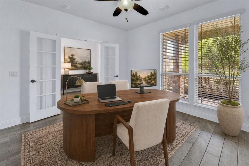 Welcome home to this stunning brick-and-stone beauty on an oversized lot on almost one fourth acre, featuring a charming front porch and an elegant rotunda entrance that sets the tone from the moment you arrive. Nestled in the highly sought-after Union Park community, this home blends thoughtful design with everyday comfort.The kitchen impresses with decorative cabinetry, a gas cooktop, abundant counter space, and a built-in bar area that flows seamlessly into the dining space—perfect for hosting or casual meals. Durable wood-look tile floors extend throughout the main level, adding both style and practicality.The spacious primary suite offers a peaceful retreat with an ensuite bath complete with a garden tub & separate shower. A private office with French doors sits just off the entry, ideal for remote work or quiet focus. Upstairs, you’ll find a secondary ensuite bedroom, plus a game room and media room that provide plenty of space for play, movie nights, or entertaining.Step outside to a covered back patio overlooking a large backyard with room to relax, garden, or gather with friends.Union Park delivers resort-style living with amenities that include pools, tennis courts, pickleball courts, a clubhouse, parks, ponds, trails, and so much more. This home offers the perfect blend of comfort, community, and convenience.